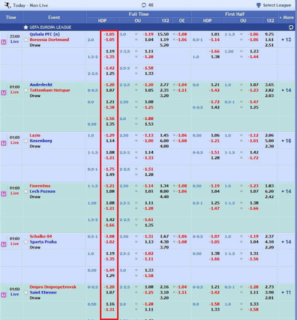 - Contohnya : Pada gambar diatas. Dnipro vs Saint Etienne (Pertandingan paling bawah pada gambar), Dnipro Ngepoor 1/4 dan memiliki nilai odds merah -1.20. Apabila tim Dnipro yang kita pilih menang, maka kita akan menang sejumlah Jumlah taruhan yang kita pasang.